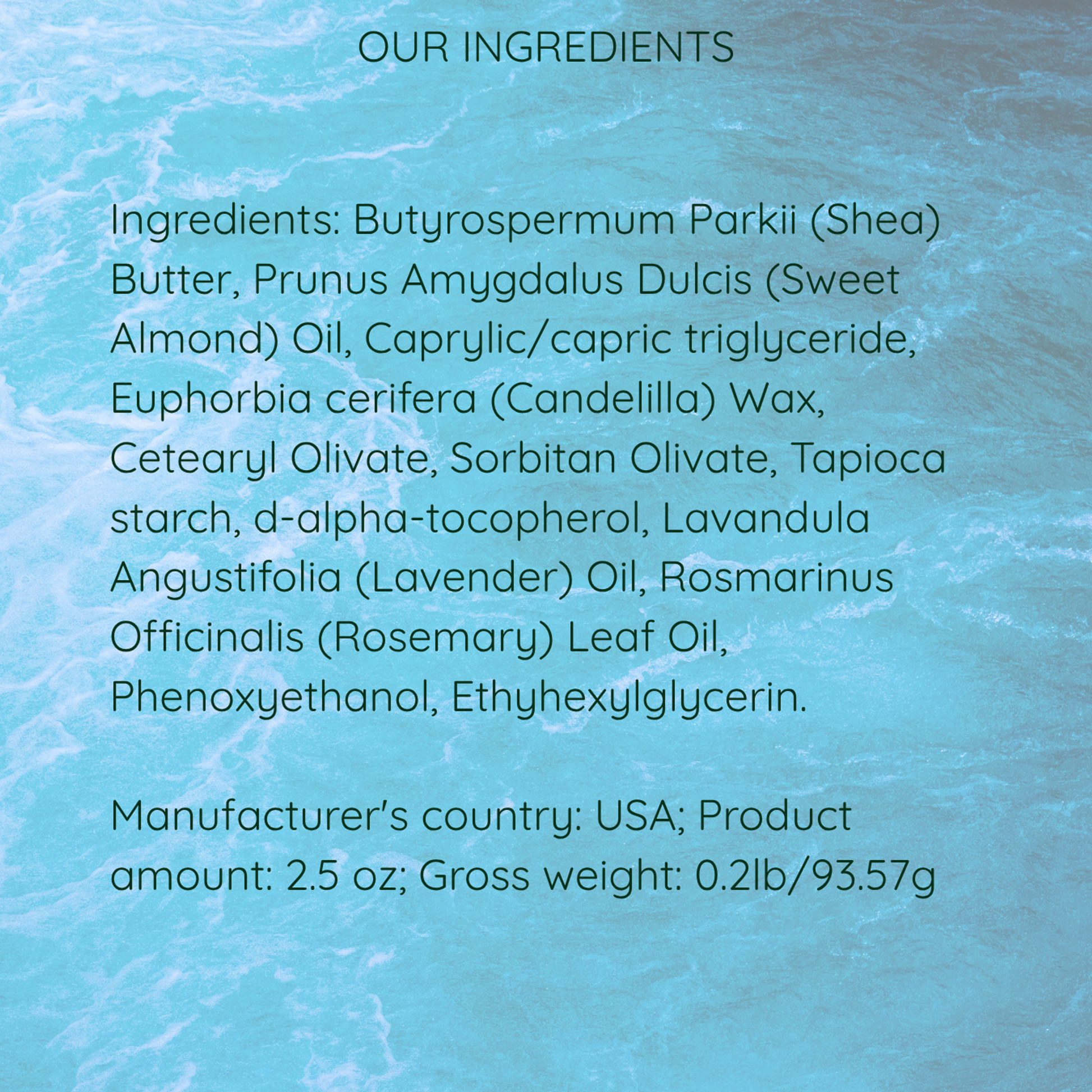 Ingredients: Butyrospermum Parkii (Shea) Butter, Prunus Amygdalus Dulcis (Sweet Almond) Oil, Caprylic/capric triglyceride, Euphorbia cerifera (Candelilla) Wax, Cetearyl Olivate, Sorbitan Olivate, Tapioca starch, d-alpha-tocopherol, Lavandula Angustifolia (Lavender) Oil, Rosmarinus Officinalis (Rosemary) Leaf Oil, Phenoxyethanol, Ethyhexylglycerin.